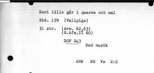 //// Kari lille går i quarna och mal //// Sid. 159 (Vallpiga) //// 31 str. (Arw. 62,63) //// (G.Afz.II 60) //// DGF 243 //// ! Med musik //// ^ ARW MS Vs 2:2 ////