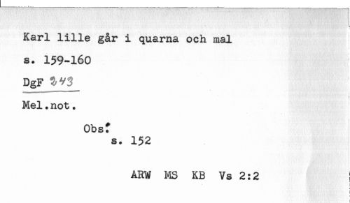 //// Karl lille går i quarna och mal //// } //// s. 159-160 //// DgF //// Mel. not. //// * ' - i M i //// * //// Obsf //// s. 152 //// ARW MS KB Vs 2:2 ! //// * = ////