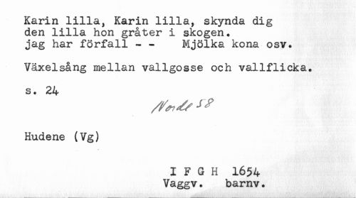 //// Karin lilla, Karin lilla, skynda dig //// den lilla hon gråter i skogen. //// jag har förfall - - Mjölka kona osv. //// Växelsång mellan vallgosse och vallflicka. //// s. 24 //// Hudene (Vg) //// I F G H 1654 //// Vaggv. barnv. ////