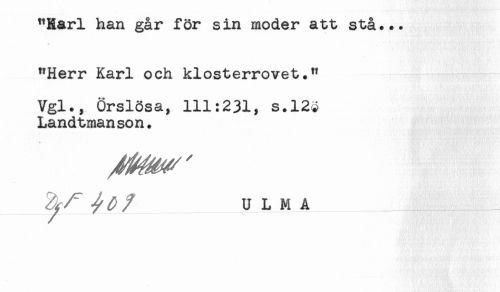 //// "Harl han går för sin moder att stå... //// K. //// "Herr Karl och klosterrovet." //// Vgl., Örslösa, 111:231, s.123 //// Landtmanson. //// * ' . - //// __ULM A__ ////