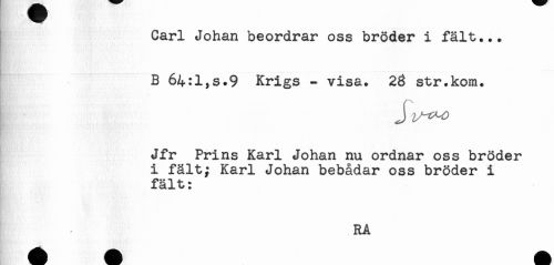 //// Carl Johan beordrar oss bröder i fält... //// B 64:1,s.9 Krigs - visa. 26 str.kom. //// I //// Jfr Prins Karl Johan nu ordnar oss bröder //// i fält; Karl Johan bebådar oss bröder i //// fält: //// RA ////