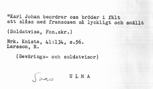 //// "Karl Johan beordrar oss bröder i fält //// att slåss med fransosen så lyckligt och snällt //// (Soldatvisa, Fon.skr.) //// Nrk. Knista, 41:134, s.56. //// Larsson, R. //// (Bevärings- och soldatvisor) ////