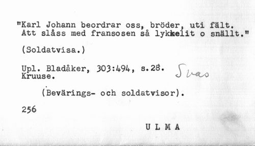 //// "Karl Johann beordrar oss, bröder, uti fält. //// Att slåss med fransosen så lyktaelit o snällt." //// (Soldatvisa.) //// Upl. Bladåker, 303:494, s.28. * //// Kruus e. J //// (Bevärings- och soldatvisor). //// 256 ////