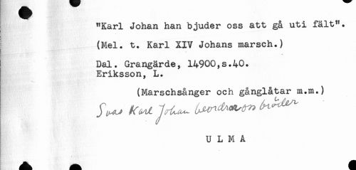 //// "Karl Johan han bjuder oss att gå uti fält". //// (Mel. t. Karl XIV Johans marsch.) //// Dal. Grangärde, 14900,s.40. //// Eriksson, L. //// (Marschsånger och gånglåtar m.m.) //// tr"*')'^, ti/ //// A. ^ ////