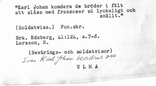 //// "Karl Johan komdera de broder i iait //// att slåss med fransoser så lyckeligt och //// snällt." //// (Soldatvisa.) Fon.skr. //// Nrk. Edsberg, 41:124, s.7-8. //// Larsson, R. //// (Bevärings- och soldatvisor) //// U L M A //// ------—-----— — . - ////