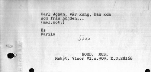 //// Carl Johan, vår kung, han kom //// som från höjden... //// (mel.not.) //// Hs //// Färila //// Aåg; NORD. MUS. //// Mskpt. Visor VI.s.909. E.U.23166 //// < ////