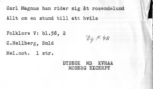 //// Carl Magnus han rider sig åt rosendelund H //// Allt om en stund till att hvila \ " //// Folklore V: bl.58, 2 //// C.Hellberg, Smid ' //// t //// Mel.not. 1 str. //// DYBECK MS KVHAA //// MOBERG EXCERPT ////