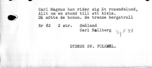 //// Carl Magnus han rider sig åt rosendelund, //// ____Allt om en stund till att hivla. //// Då mötte de honom, de trenne bergatroll //// Nr 32 2 str. Småland //// Carl Hellberg /r //// DYBECK SV. FOLKBEL. //// t //// i ////