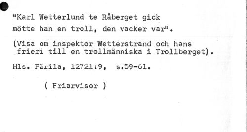 //// "Karl Wetterlund te Råberget gick //// mötte han en troll, den vacker var". //// . //// (Visa om inspektor Wetterstrand och hans //// frieri till en trollmänniska i Trollberget)* ; //// Hls. Färila, 12721:9, s.59-61. //// ( Friarvisor ) //// E ////