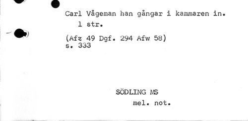 //// Carl Vågeman han gångar i kammaren in. //// 1 str. //// : //// (Afz 49 Dgf. 294 Afw 58) //// s. 333 //// i //// SODLING MS //// mel. not. ////