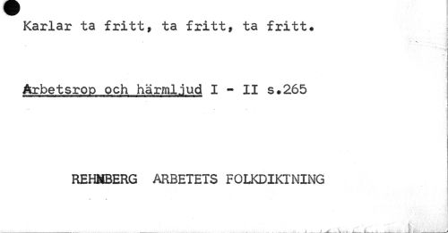 //// Karlar ta fritt, ta fritt, ta fritt. //// * * //// Arbetsrop och härmljud 1-11 s.265 //// < //// REHNBERG ARBETETS FOLKDIKTNING ////