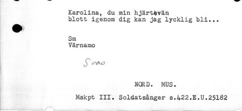 //// Karolina, du min hjärtevän //// blott igenom dig kan jag lycklig bli... //// Sm //// Värnamo //// NCR D. MUS. //// Mskpt III. Soldatsånger s.422.E.U.25132 //// _ _____________________________________________________________________________ _ ////