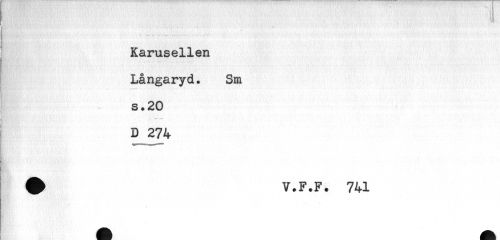//// *'. . - - - -- - //// j - — ^ , ... . — J //// Karusellen //// Långaryd. Sm //// 1%. 'i ' * . .'*---* //// s.20 //// 3 ....... //// D 274 //// r //// W V.F.F. 741 ////