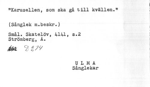 //// ! //// "Karusellen, som ska gå till kvällen." ; //// * //// . //// (Sånglek m.beskr.) //// < //// -* //// Smål. Skatelöv, 4141, s.2 ! //// Strömberg, A. ////