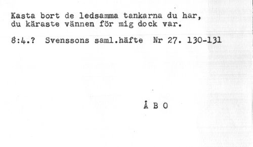 //// Kasta bort de ledsamma tankarna du har, //// du käraste vännen för mig dock var. //// i //// < //// 6:4.? Svenssons saml.häfte Nr 27. 130-131 //// * //// A B 0 ////