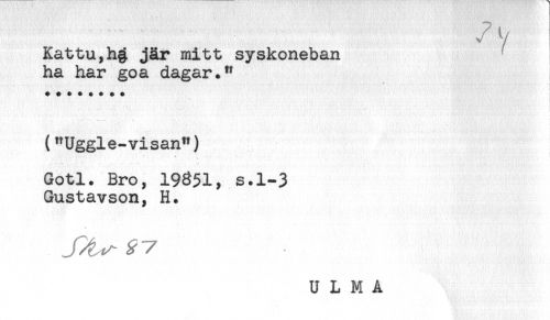 //// Kattu,hg jår mitt syskoneban //// ha har goa dagar." //// ("Uggle-visan") //// Gotl. Bro, 19^51, s.1-3 //// Gustavson, H. ////
