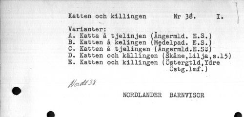 //// Katten och killingen Nr 38. 1. //// Varianter: //// A. Katta å tjelinjen (Ångermld. E.S.) //// B. Katten å kelingen (Medelpad. E.S.) //// C. Katten å tjelingen (Ångermld.E.Sö) //// D. Katten och källingen (Skåne,Lilja,s.15) //// E. Katten och killingen (Östergtld,Ydre //// Östg.lmf.) ////