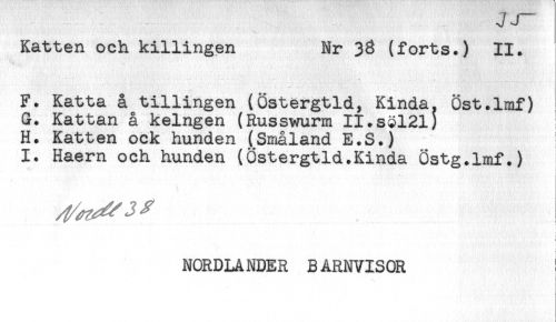 //// Katten och killingen Nr 38 (forts.) II. //// --*--' - . . * //// F. Katta å tillingen (Östergtld, Kinda. Öst.lmf) //// G. Kattan å kelngen (Russwurm II.s$121) //// H. Katten ock hunden (Småland E.S.) //// I. Haern och hunden (Östergtld.Kinda Östg.lmf.) //// NORDLANDER BARNVISOR ////