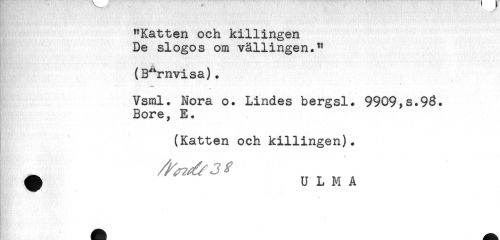 //// "Katten och killingen //// De slogos om vällingen." //// (Barnvisa). //// Vsml. Nora o. Lindes bergsl. 9909,s.98. //// Bore, E. //// (Katten och killingen). //// ^ U L M A ////