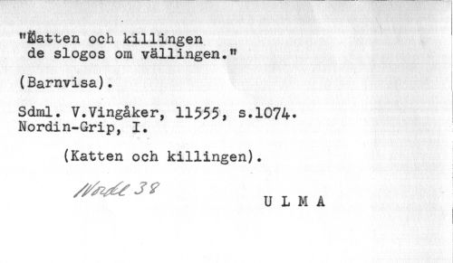 //// "Eatten och killingen //// de slogos om vällingen." //// (Barnvisa). //// Sdml. V.Vingåker, 11555, s.1074* //// Nordin-Grip, 1. //// (Katten och killingen). //// ^^^ n T M A //// U L M A //// i //// i ////