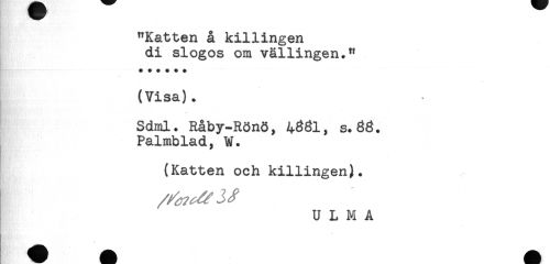 //// "Katten å killingen //// di slogos om vällingen." //// (Visa). //// Sdml. Råby-Rönö, 4331, s.33. //// Palmblad, W. //// (Katten och killingen). //// U L M A //// t ////