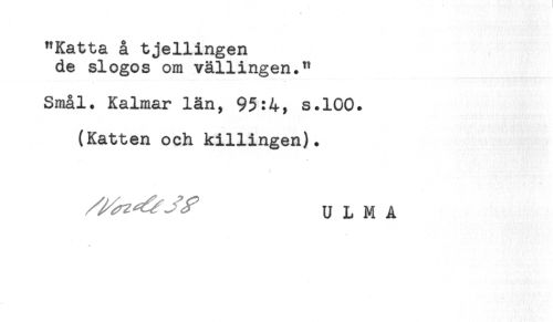 //// "Katta å tjellingen //// de slogos om vällingen." //// Smål. Kalmar län, 95:4, s.100. //// (Katten och killingen). //// u L M A ////