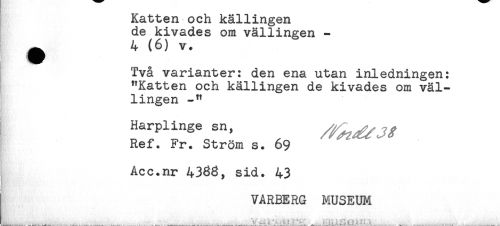 //// Katten och källingen //// de kivades om vällingen - //// ^ 4 (6) v. //// Två varianter: den ena utan inledningen: //// "Katten och källingen de kivades om väl- //// lingen //// Harplinge sn, //// Ref. Fr. Ström s. 69 //// Acc.nr 4388, sid. 43 //// t //// VARBERG MUSEUM //// * * - " ' ' ' : ' . '*' .**-;'; .-'t. //// _ . ^ .............. ' ." - . :..:< -:. .'. -- - ////