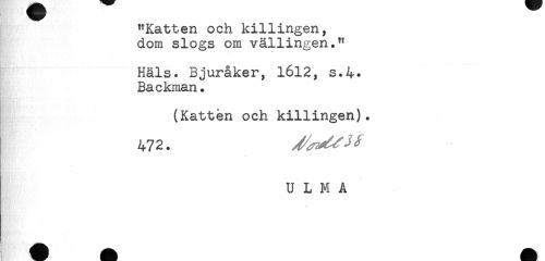 //// "Katten och killingen, //// dom slogs om vällingen." //// Häls. Bjuråker, 1612, s.4. //// Backman. //// (Katten och killingen). //// 472. //// U L M A ////