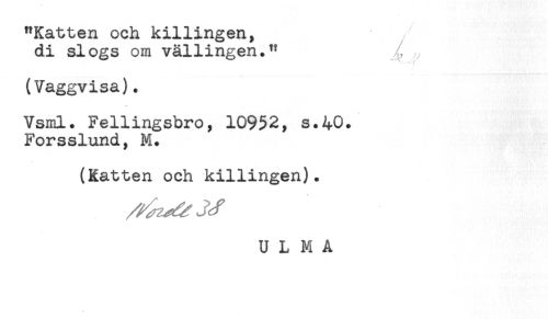 //// "Katten och killingen, //// di slogs om vällingen." Z //// (Vaggvisa). //// .t //// Vsml. Fellingsbro, 10952, s.40. //// Forsslund, M. //// (Katten och killingen). //// U L M A ////