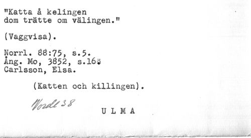 //// "Katta å kelingen //// dom trätte om välingen." //// (Vaggvisa). //// Norrl. 68:75, s.5. //// Ang. Mo, 3^52, s.l6$ //// Carlsson, Elsa. //// (Katten och killingen). //// U L M A ////