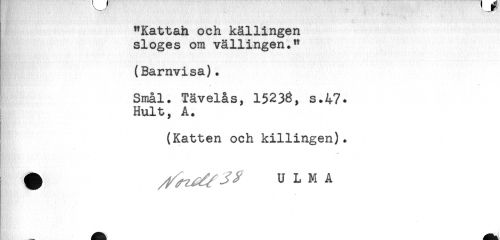 //// t-' . 'V)- t ' , .. ,.' * .. '.'... ' ' yS')! '* -''..'i'**'.' //// "Kattah och källingen //// sloges om vällingen." //// (Barnvisa). //// Smal. Tävelås, 15238, s.47. //// Hult, A. //// (Katten och killingen). //// # U L M A ////