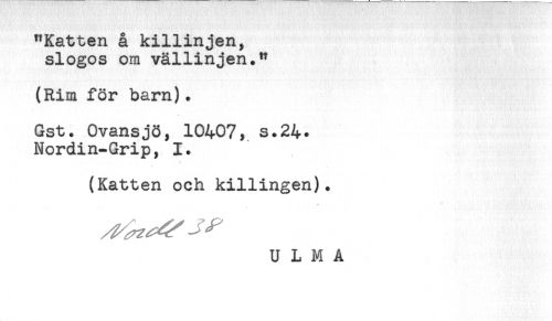 //// "Katten å killinjen, //// slogos om vällinjen." //// (Rim för barn). //// Gst. Ovansjö, 10407, s.24* //// Nordin-Grip, 1. //// (Katten och killingen). //// U L M A ////