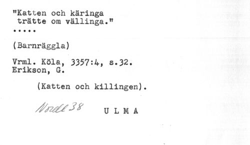 //// "Katten och käringa //// trätte om vällinga." //// ***** //// (Barnräggla) //// Vrml. Köla, 3357:4, s.32. //// Erikson, G. //// (Katten och killingen). //// U L M A ////