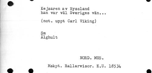 //// Kejsaren av Ryssland //// han var väl Sveriges vän... //// (not. uppt Carl Viking) //// Sm //// Älghult //// NORD. MUS. //// Mskpt. Rallarvisor. E.U. 18534 ////