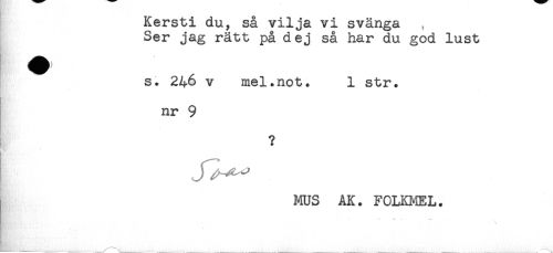 //// Kersti du, så vilja vi svänga , //// Ser jag rätt på dej så har du god lust //// s. 246 v mel.not. 1 str. //// nr 9 //// ? //// [ //// MUS AK. FOLKMEL. //// :_______ _______________\........................................ _ _ _ _ ////