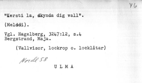 //// y & //// "Kersti la, dkynda dig vall". //// (Melddi). //// ——^ * //// Vgl. Hagelberg, 3247:12, s.4 //// Bergstrand, Maja. //// (Vallvisor, lockrop o. locklåtar) //// U L M A ////