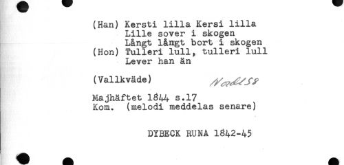 //// (Han) Kersti lilla Kersi lilla //// Lille sover i skogen //// Långt långt bort i skogen //// (Hon) Tulleri lull, tulleri lull //// Lever han än //// (Vallkväde) //// Majhäftet 1344 s.17 //// Kom. (melodi meddelas senare) //// * //// DYBECK RUNA 1842-45 //// <1! ä Ht ////