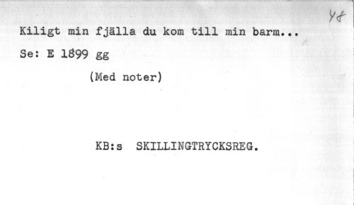 //// Kiligt min fjälla du kom till min barm... //// ! //// Se: E 1899 gg //// f //// (Med noter) //// t //// * < //// ! //// i //// i //// < //// KB:s SKILLINGTRYCKSREG. //// ! //// i //// i //// ! ////