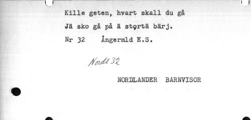 //// Kille geten, hvart skall du gå //// <t ..... //// Jå sko gå på ä styrtä bär j. //// Nr 32 Ångermld E.S. //// NORDLANDER BARNVISOR //// * ////