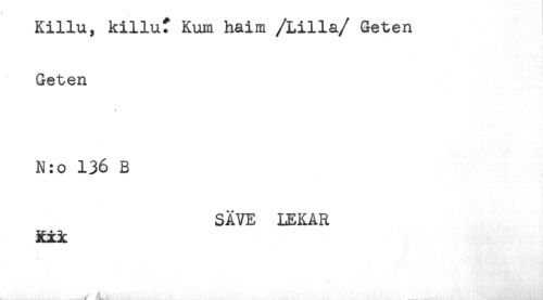 //// Killu, killuf Kum haim /Lilla/ Geten //// Geten //// N:o 136 B //// SÄVE LEKAR //// Xik ////
