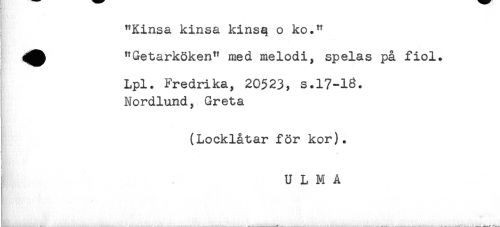 //// "Kinsa kinsa kinsq o ko." //// SR'' //// ^^ "Getarköken" med melodi, spelas på fiol. //// i //// Lpl. Fredrika, 20523, s.17-13. //// Nordlund, Greta //// (Locklåtar för kor). //// i //// U L M A ////