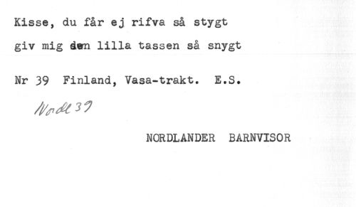 //// Kisse, du får ej rifva så stygt //// giv mig dam lilla tassen så snygt //// Nr 39 Finland, Vasa-trakt. E.S. //// NORDLANDER BARNVISOR ////