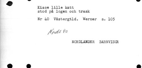 //// Kisse lille katt //// stod på logen och träsk //// Nr 40 Västergtld. Werner s. 105 //// NORDLANDER BARNVISOR //// * //// * //// Hk ^ ////