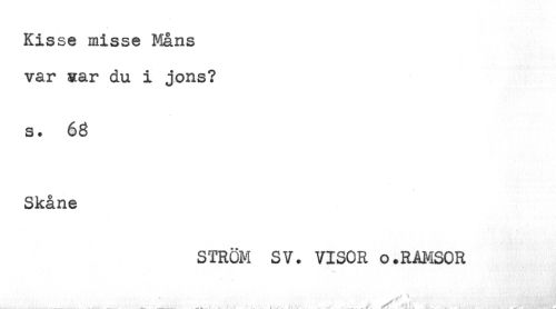 //// Kisse misse Måns //// var aar du i jons? //// s. 68 //// Skåne //// STRÖM SV. VISOR o.RAMSOR //// ....................____ ' Jt-, . ' . ! ^ . / '.' - - * , ^ ////