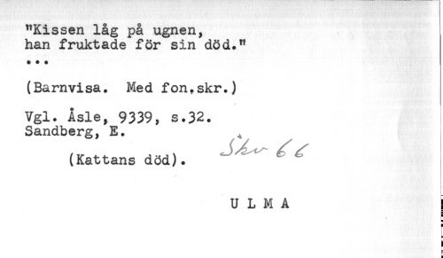 //// "Hissen låg på ugnen, //// han fruktade för sin död." //// * *. //// (Barnvisa. Medfon.skr.) //// Vgl. Åsle, 9339, s.32. //// Sandberg, E. ^ //// (Kattans död). //// U L M A } //// H //// i //// < //// ) ////