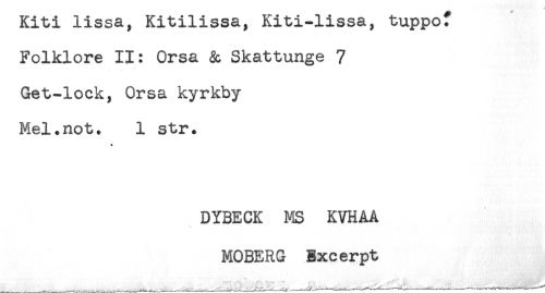 //// Kiti lissa, Kitilissa, hiti-lissa, tuppo. //// Folklore II: Orsa & Skattunge 7 //// Get-lock, Orsa kyrkby //// Mel.not. 1 str. //// * //// DYBECK MS KVHAA //// MOBERG Bxcerpt ////
