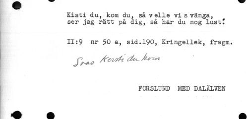 //// Kisti du, kom du, så velie vi s vänga, //// ser jag rätt på dig, så har du nog lustf //// BiMw a* -. - - - -..........-- ... - - - - - - //// 11:9 nr 50 a, sid.190, Kringellek, fragm. //// FORSLUND MED DALÄLVEN ////