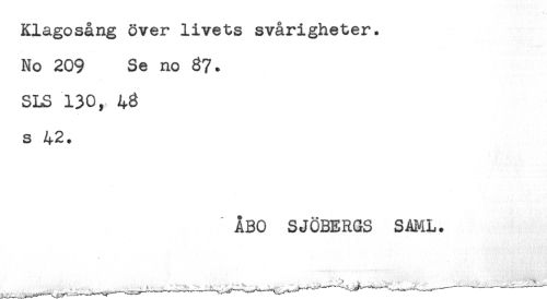 //// Klagosång över livets svårigheter. //// No 209 Se no 87. //// SLS 130, //// s 42. //// ÅBO SJÖBERGS SAML. ////