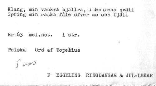 //// Klang, min vackra bjällra, i cbn sena qväll //// Spring min raska fåle öfver mo och fjäll //// Nr 63 mel.not. 1 str. //// Polska Ord af Tope&ius //// F EGGELING RINGDANSAR & JUL-LEKAR //// .. <___* - < ^t/*'''' ' - ^ ' -jcss^ldC^^J*^* ////