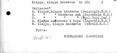 //// ...... —j-f — ; J^f—--------*----------- -*- — //// Varianter" //// ^ A. Klappa,klappa händerna (Helsingld.E.S.) //// * B. " " händerna små (Stockholm E.S.) //// C. " " " " (yppl.Uppl.lmf.) //// D. Klappa småhannen i hopa (Angermld.E.S.) //// E. Klappa, klappa handarna (värmld.E.S.) //// Forts. //// j ^ ^ NORDLANDER B ARNVISOR //// ..- __________________^ - -________________________________ _______________ _________________ _____ __ ////